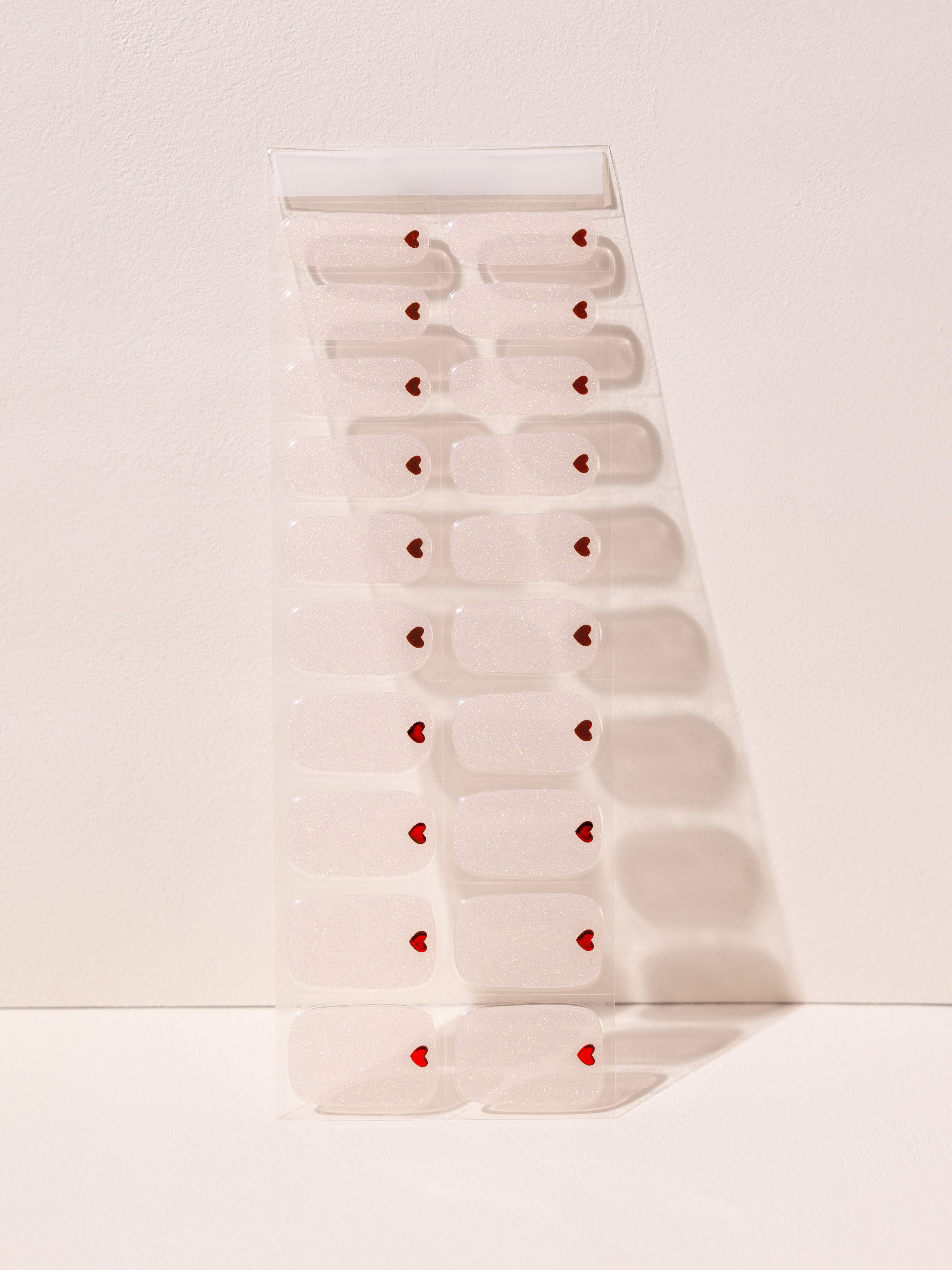 Pearly, sparkly white transparent vanilla chrome effect nails with tiny red metallic hearts. Subtle and sophisticated minimal nail art!